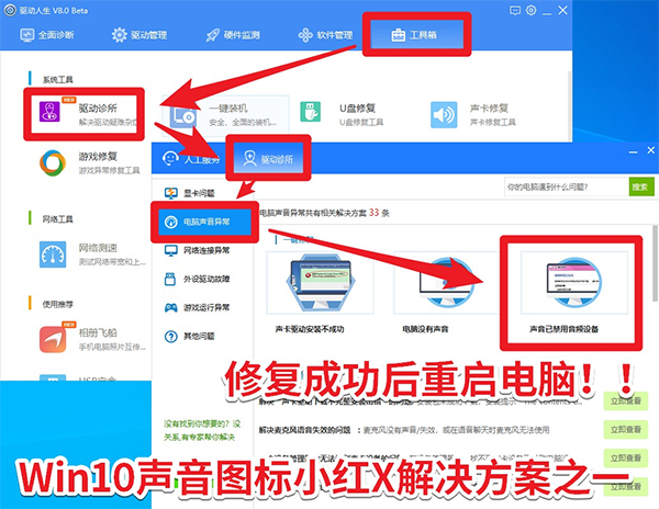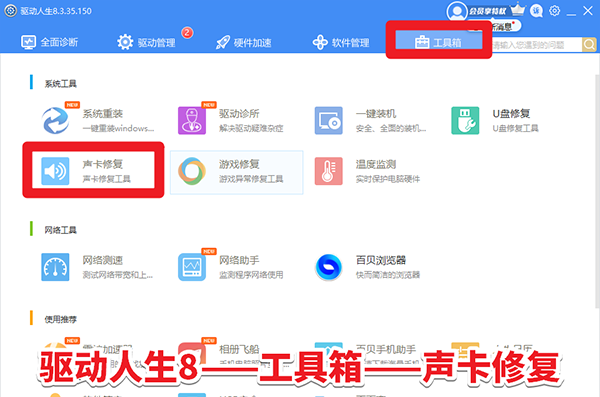 打开驱动人生海外版——点击声卡驱动右侧的工具箱——声卡修复工具——一键修复声卡问题。