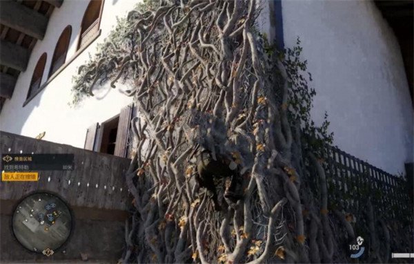 2、工作台2:它位于地图的最左方,在最边缘地带的建筑物的三楼,我们需要顺着楼外的藤蔓才能爬入,进入后就可以在国旗找到它了。