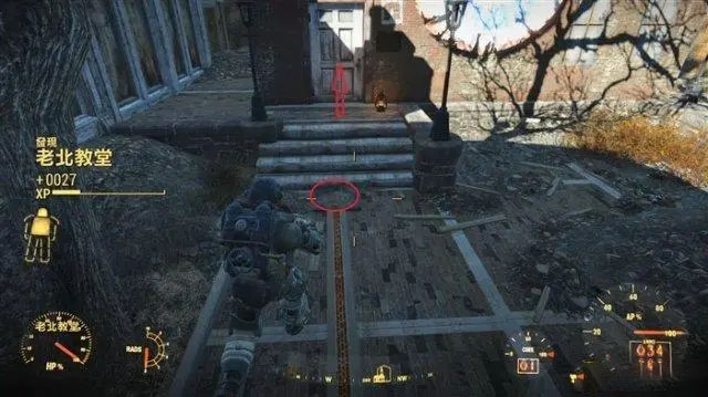 3、中途可能会有一些类似血迹的线让你转弯,还有一些被废墟掩盖。途径马萨诸塞州、墓地、法尼尔厅等,最终我们来到老北教堂,如图指针所标注位置。