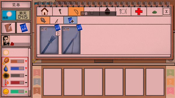 近战可以叉鱼,把长矛拉到海的卡片上就行;远程的投石索则可以拿来扔椰子。