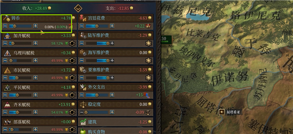 打开经济界面,调整铸币,开局需要将这一项调整到0%左右。