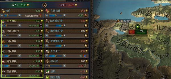 然后需要调整各阶层的税收,将所有阶层的好感度保持在50%上下,保证阶层好感度为正。