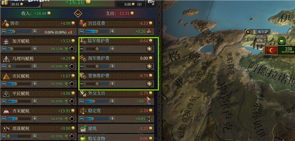 接下来将陆军、海军、要塞的维护费都拉到最低,必要的时候也可以拆除一两座要塞。