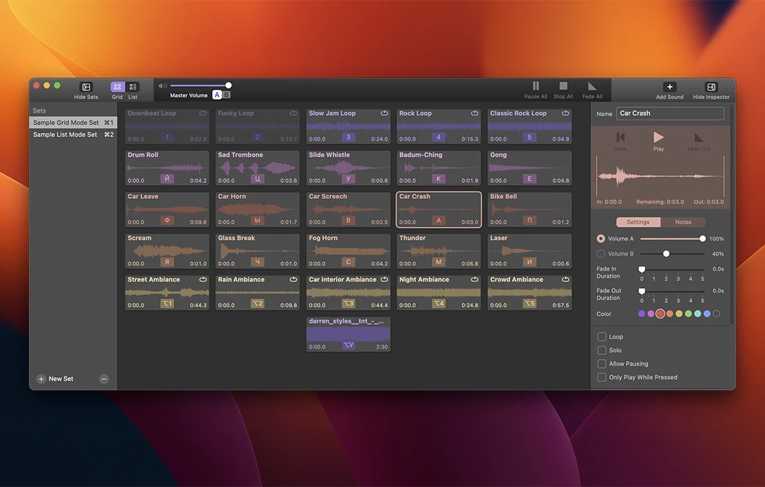 Farrago 是快速播放声音片段、音频效果和音乐剪辑的最佳方式。播客可以使用 Farrago 在录音过程中加入音乐伴奏和音效,而剧院技术人员可以为现场表演播放音频。无论您是需要快速访问大型声音库还是播放定义的音频列表,Farrago 都可以轻松搞定。Farrago 的瓷砖网格允许您按照您想要的方式放置声音。将您的声音放在指尖,按照您想要的方式工作。使用检查器自定义每种声音的设置以满足您的需要。设置图块名称和颜色、调整入点/出点、更改淡入淡出设置等。根据情绪、表演或您喜欢的任何其他标准创建单独的音频组。使用套件可以更轻松地控制声音。
