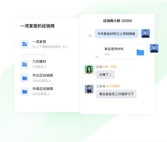 在上下游,你可以统一管理供应商、经销商等业务伙伴的联系人,快速找人沟通;使用文档、会议、日程、微盘等工具高效协作,跨企业共享应用打通业务流程。
