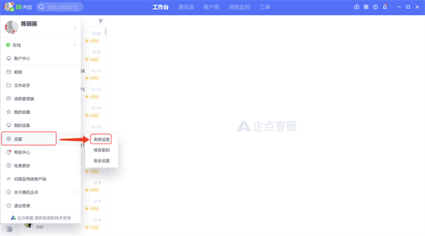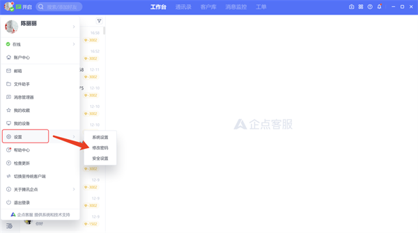 在【设置】中,可修改密码,进行安全、权限等一系列设置;在【帮助】中,可快速跳转帮助中心,了解企点功能或提交建议,帮助你更好地使用企点产品;