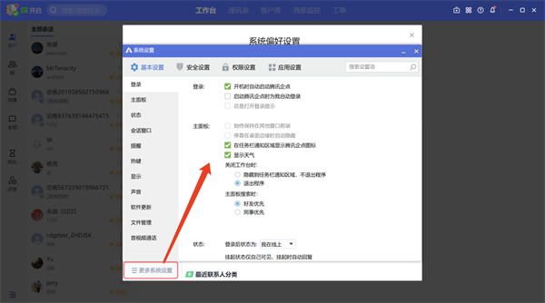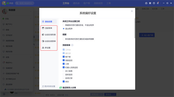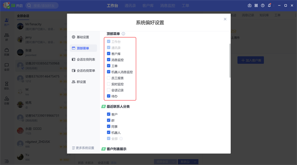 支持自定义工作台面板,包括工作台的顶部导航、会话左侧列表、会话右侧菜单、最近联系人及群设置,如下图: