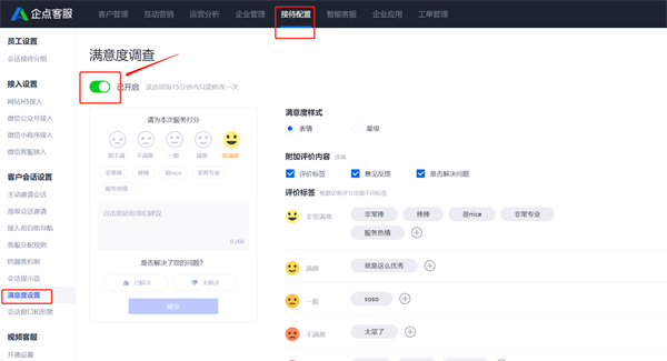 在账户中心的【接待配置】-【满意度调查】中,点击“不开启”满意度按钮即可关闭满意度调查。