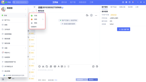 在主菜单中还可切换员工状态,包括在线、挂起、离线;可切换账号或退出当前账号;