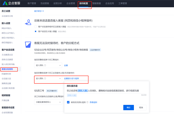 可在账户中心【接待配置】-【客服分配规则】接待设置中,更改或删除排队提示语。