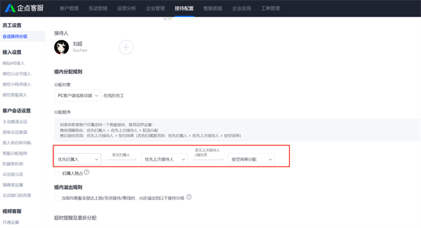 优先归属人(归属人独占指只能由归属客服接待进线用户)-优先上次接待人 -轮流分配