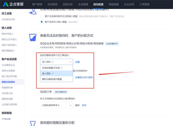 这种情况下管理员可以去账户中心修改分配规则(接待配置-客服分配规则),选择客服无法及时接待时,客户的分配方式,建议可以设置引导留言、进入排队或者仅告知客服不在线。该项在未设置前,默认为随机分配,因此关闭接待时还可能存在被随机分配的可能性。