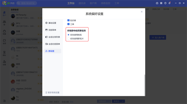 支持选择所有群中的同事名称是使用姓名,或优先使用群名片,如下图: