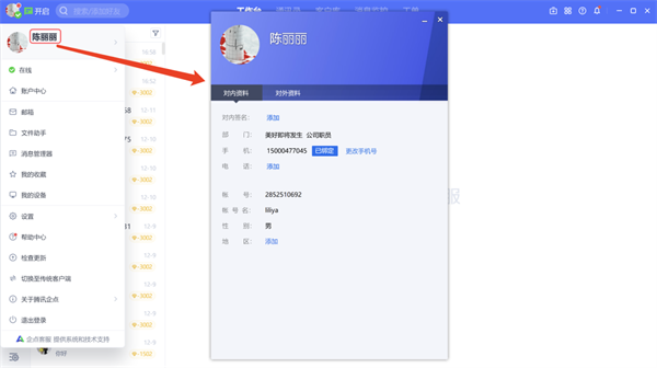 工作台左上角设有主菜单,点击员工头像即可下拉展开;在主菜单中,点击员工昵称可弹出员工资料卡,便捷修改员工对内对外资料。