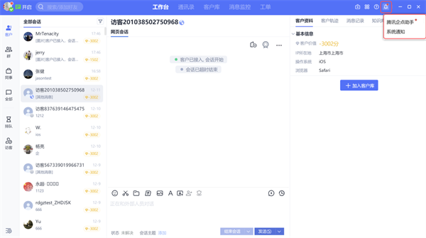 工作台右侧设有系统通知、企点助手入口,有新消息包括全局新消息及系统新消息、时将以红点的形式提示。