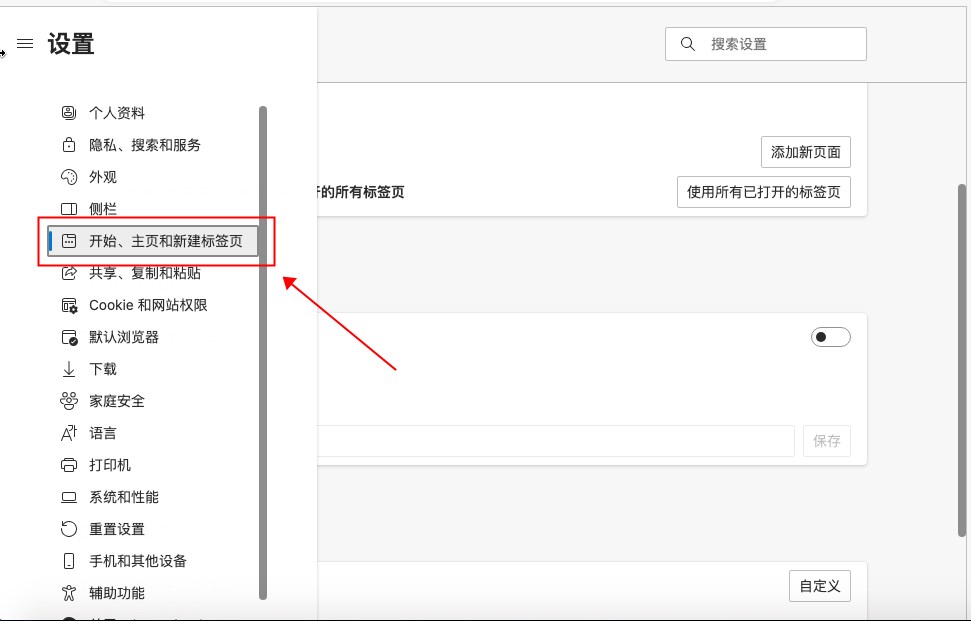 3、在弹出的设置界面中,找到打开方式,选择【开始、主页和新建标签页】选项。