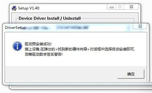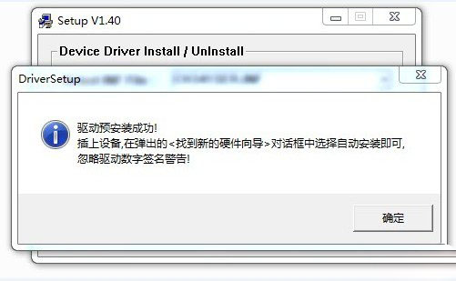 选择界面上的INSTALL安装驱动程序,安装过程可能持续30秒左右。在弹出以下对话框时表示驱动程序安装成功。