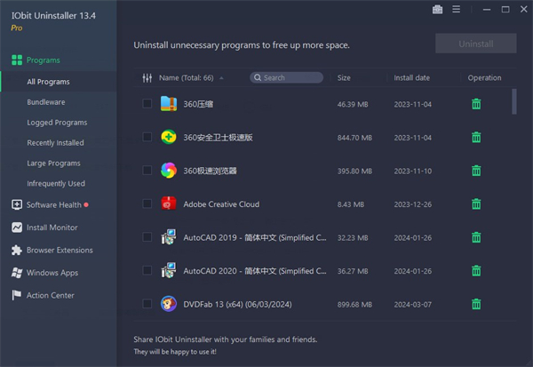 IObit Uninstaller Pro是一款类似的Windows添加/删除程序,其体积小巧,功能强大,运行速度快,可靠性高。它能够有效地取代Windows自带的卸载功能。通过它,你可以彻底卸载不需要的软件,不留下软件的相关信息,并且不会造成系统崩溃。IObit Uninstaller Pro虽然小巧可是五脏俱全,它包含的功能有一键移除工具列,批次移除和强制移除等功能。需要的朋友可以来收藏下载使用试试哈!