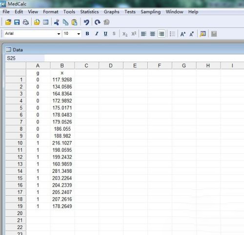 2、输入要分析的数据,第一列命名为g,表示分组;第二列命名为x,表示数据。分组用0和1表示。
