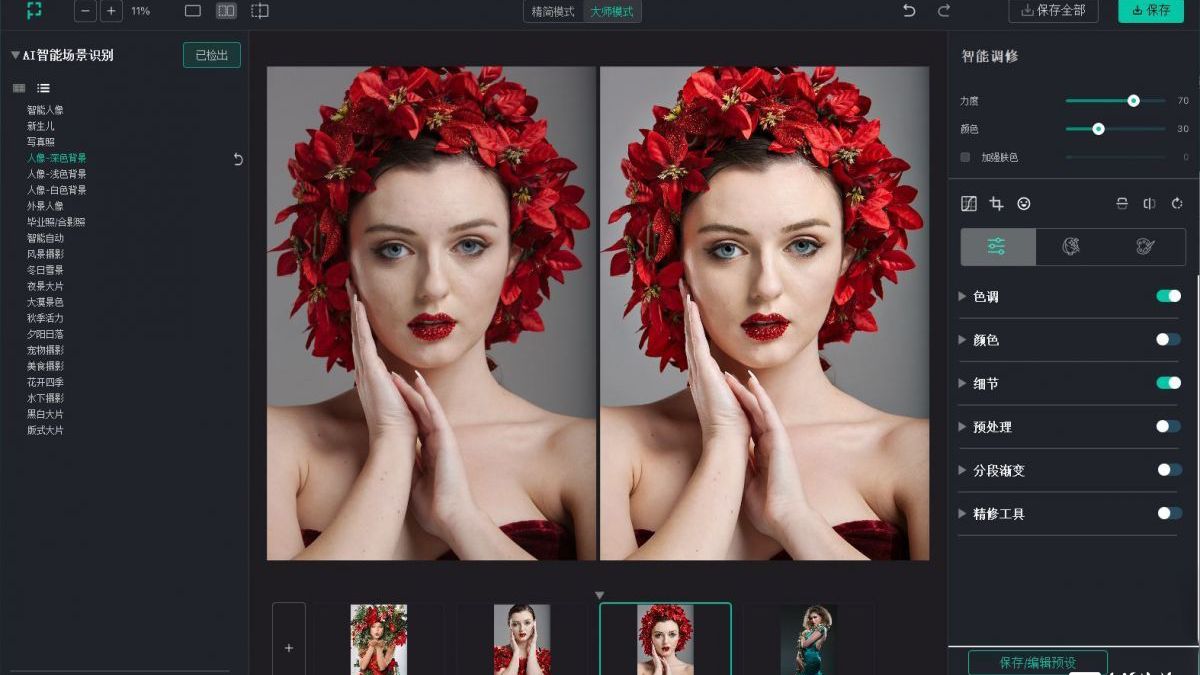 3、提供一个预设的功能,软件为用户提供几种调色的常见参数