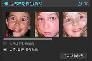 由许多工具在眼睛、人脸、皮肤及妆容组上应用的校正将仅应用于已在照片中识别的人脸。 此人脸选择工具允许你查看哪些人脸是自动识别的。