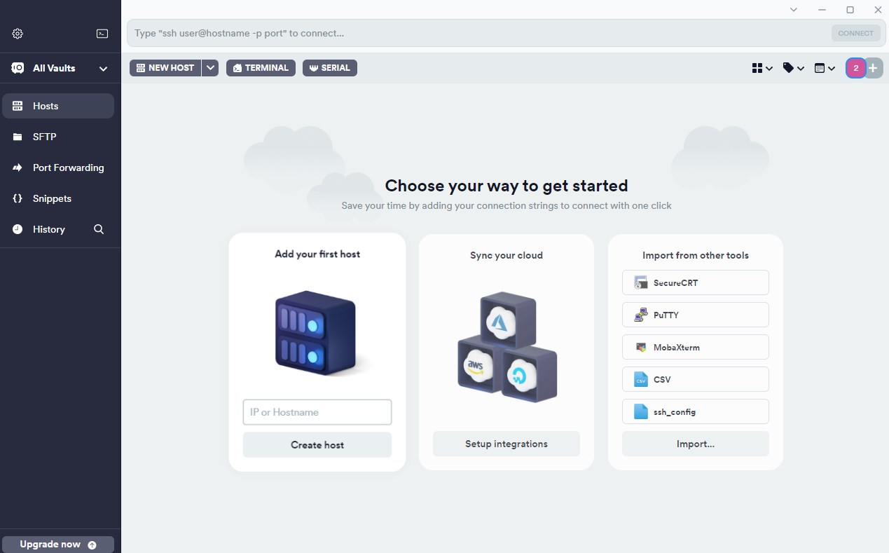 3、上都可以使用Termius享受精美的手工界面支持SSH、Mosh和Telnet会话。