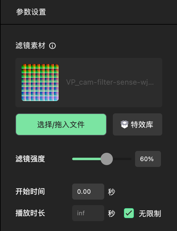 滤镜效果播放的总时长,可无限播放,去掉勾选可填写自定义时长