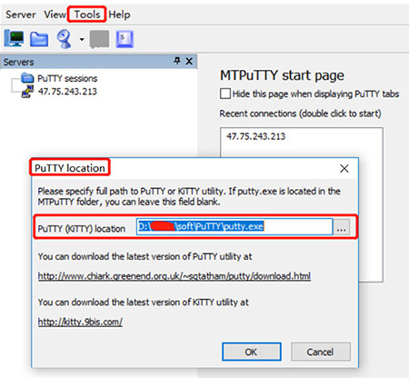 打开MTPuTTY,进入Tools->PuTTY location,选择上面putty的安装目录即可。