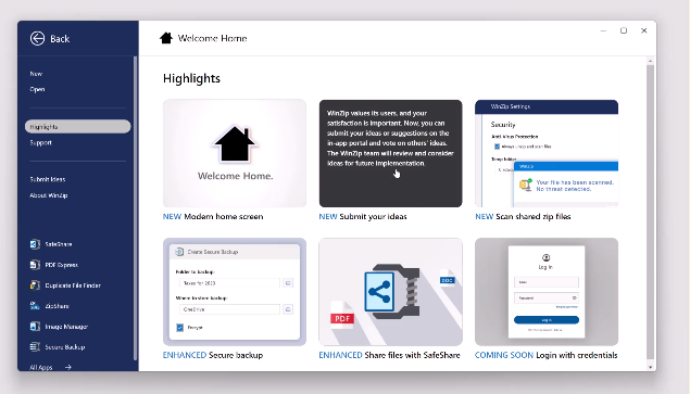 引入新的主界面之后,用户现在可以探索压缩应用以外的更多海量应用程序,轻松访问新的想法反馈门户,畅览自助式知识库。此外,已为客户提供新产品信息和更新,以便客户掌握最新资讯。