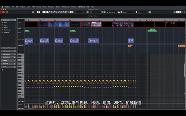 点击钢琴卷帘窗中的Show/Hide按钮,就可以看到上方出现视频、标记、速度、和弦、拍号轨道。在该窗口进行编辑或录制MIDI的时候,可以方便地实时同步观察全局信息。