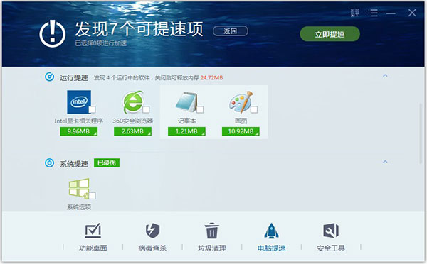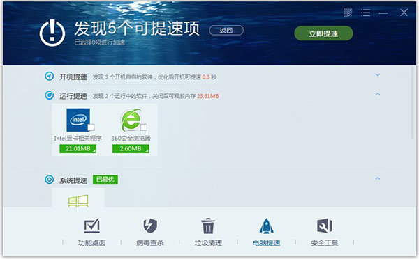 电脑优化功能主要分为四大模块:开机加速、网络加速、系统加速及垃圾清理。