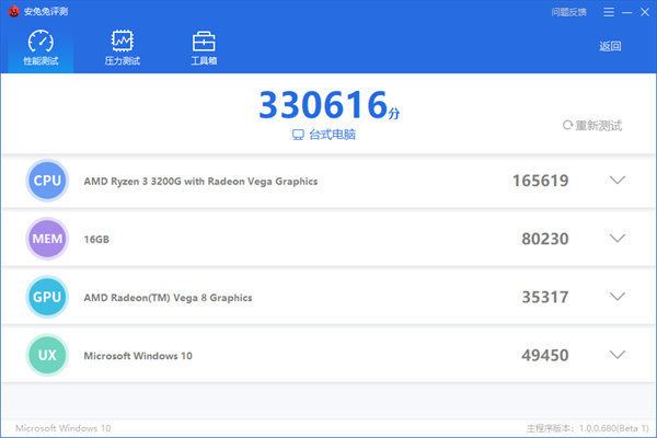 4、与其它版本一样,安兔兔评测Windows版共提供了四大测试项目,分别为CPU、GPU、MEM和UX。